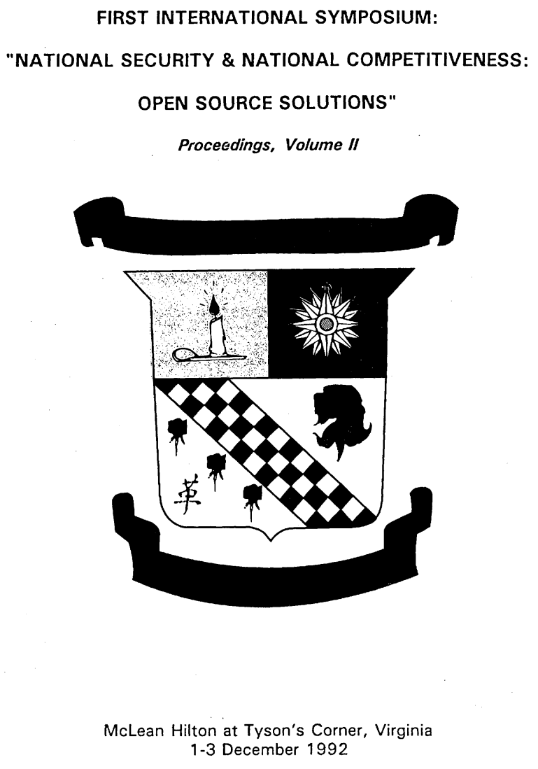 1. FIRST INTERNATIONAL SYMPOSIUM: NATIONAL SECURITY & NATIONAL COMPETITIVENESS: OPEN SOURCE SOLUTIONS Proceedings, Volume I. Titlepage and coat of arms, appreciations and table of contents.